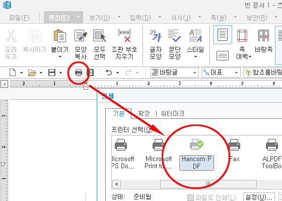인쇄에서 pdf 프린터를 선택하고